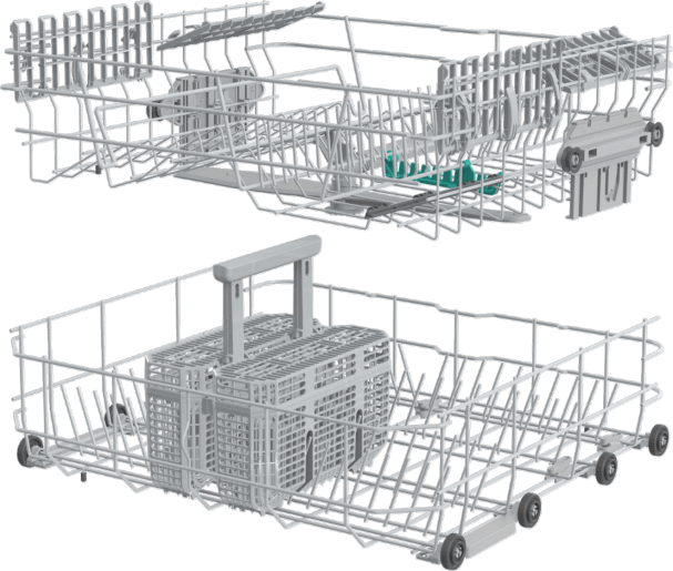 Nederste kurv består afTrådkurv med brede mellemrum Fældbar og delelig tallerkenrække bagerst Bestikkurv